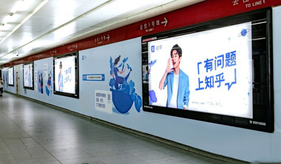 當(dāng)然,知乎不滿足于現(xiàn)有用戶群體,在線上競爭日益激烈的今天,它將目光放在了能更快速傳播品牌價值的戶外廣告,乘坐地鐵通勤的用戶以其高收入、高消費(fèi)的人群特點(diǎn)引起了知乎的注意。由于地鐵廣告形式種類繁多,選擇合適的廣告形式尤為重要,作為知名品牌的知乎,選擇了廣告面積巨大、效果更為震撼的地鐵品牌專區(qū)廣告形式,這種地鐵廣告形式能讓大家快速記住知乎這個品牌。
