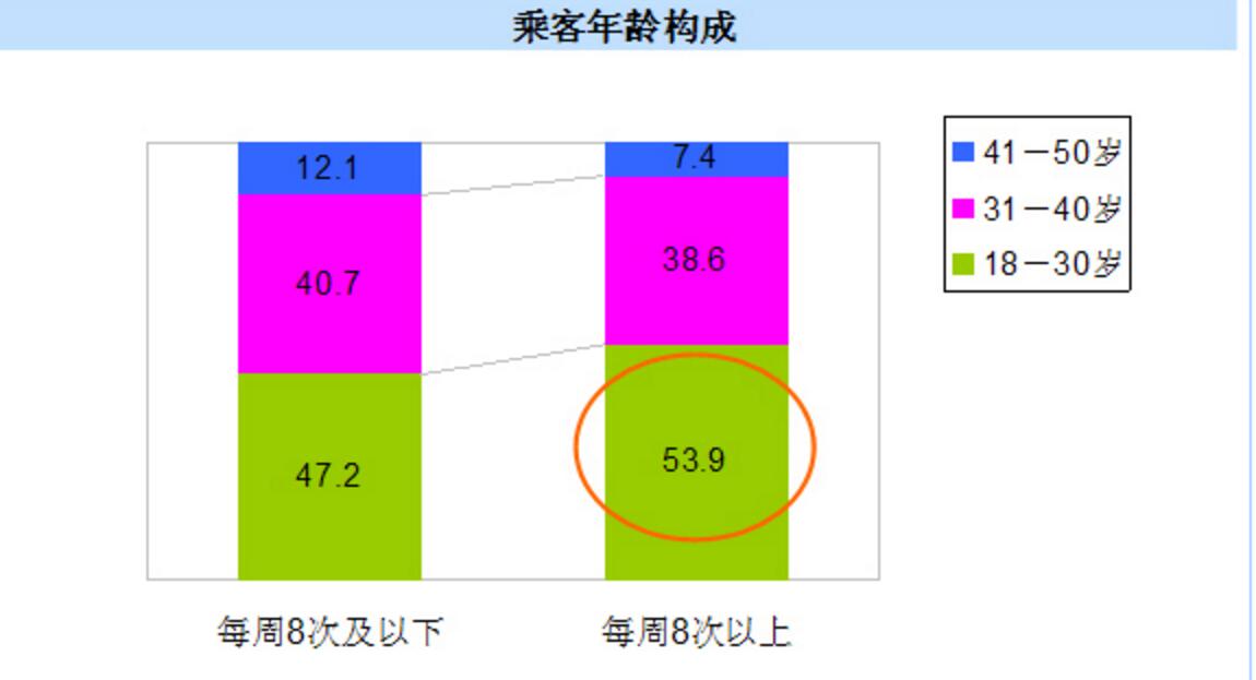 每周乘坐8次以上的乘客中,超過半數(shù)是18-30歲的年輕人。處于這一年齡段的人具有極強的消費欲望,也是時尚潮流的引領(lǐng)者。