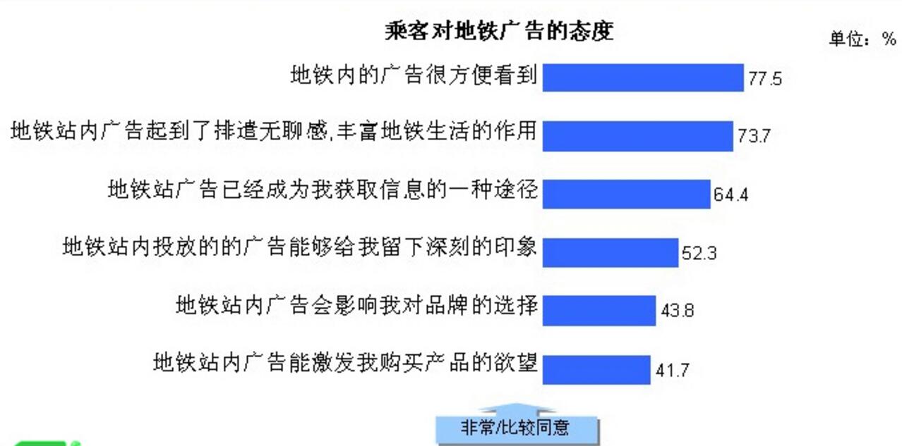 地鐵廣告接收便利性得到了乘客一致認同;同時,地鐵廣告緩解無聊感,是乘客的主要信息途徑,能給乘客留下很深的印象。此外,超過四成的乘客認為地鐵廣告會激發(fā)購買欲望、影響品牌選擇。
