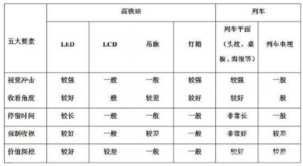 高鐵廣告媒體傳播的節(jié)點(diǎn)特性明顯,為社會化價值觀傳播提供了契機(jī)。回家、探親、學(xué)流、旅游等出行節(jié)點(diǎn)為企業(yè)在階段行品牌傳播上創(chuàng)造了社會化價值傳播內(nèi)容。高鐵站內(nèi)媒介優(yōu)劣勢分析高鐵LCD媒體:媒體位置較散,畫面小,品質(zhì)低,關(guān)注度較低;高鐵吊旗媒體:媒體位置過高,超出正常的視覺范圍,光線暗,導(dǎo)致到達(dá)率較低;列車電視媒體:媒體點(diǎn)位少,覆蓋范圍有限;廣告時段一小時一次,品牌曝光率低;列車雜志媒體:受旅客自主取閱影響,5個座位一份,廣告到達(dá)率低;翻閱時存在廣告抵觸心理,會直接翻過,接觸率低;漏放丟失嚴(yán)重,監(jiān)測困難;高鐵LED媒體:與車次信息結(jié)合,強(qiáng)制觀看,廣告到達(dá)率高;站內(nèi)唯一權(quán)威發(fā)布平臺,具備公信力;媒體位置較好,畫面大,視覺震撼強(qiáng),關(guān)注度高。列車平面媒體:媒體資源豐富,可根據(jù)車型、線路劃分各級消費(fèi)人群;位置醒目,可視效果好,沖擊力強(qiáng);面對面,一對一近距離吸引,到達(dá)率高;高鐵燈箱廣告:媒體位置較多,形成點(diǎn)攔截;部分媒體位置醒目,干擾媒體少,到達(dá)率高;