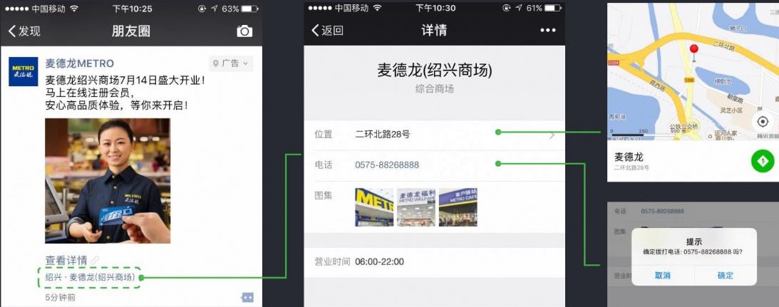 廣告落地頁可配置“查看詳情”、“領(lǐng)取優(yōu)惠”或“預約活動”,點擊后跳轉(zhuǎn) H5詳情模板頁(支持收集信息或品牌推廣)、公眾號文章;點擊門店標識,跳轉(zhuǎn)門店詳情頁。