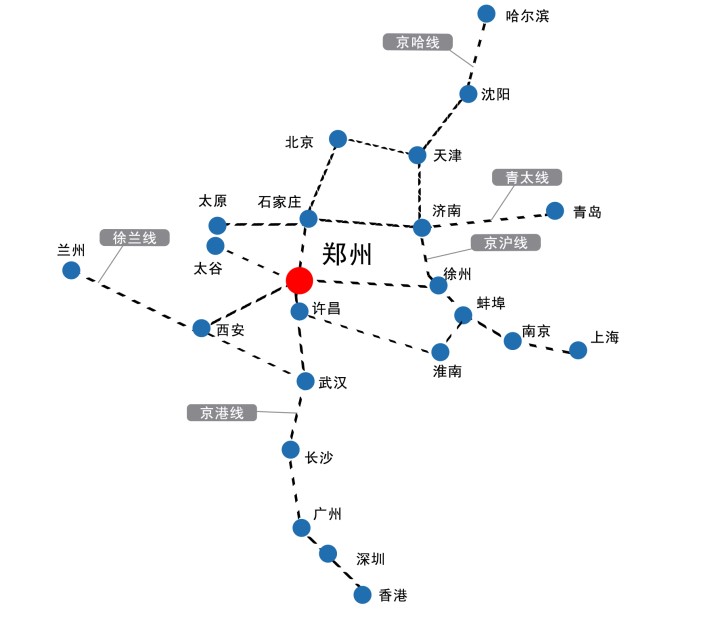 十五條高鐵線路始發(fā):徐蘭線與京港高鐵交匯處,是鄭西高鐵、鄭徐高鐵、鄭渝高鐵等國家高鐵干線及鄭開城際鐵路、鄭焦城際鐵路等中原城市群軌道交通的始發(fā)站 輻射國內(nèi)核心經(jīng)濟圈:每日開行列車可輻射到環(huán)渤海經(jīng)濟圈、中部經(jīng)濟圈、珠三角經(jīng)濟圈、西南/北經(jīng)濟圈。