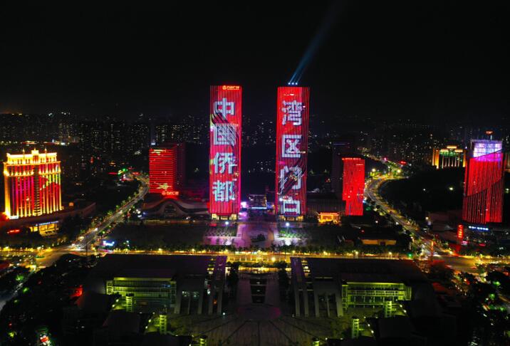 城市地標(biāo)燈光秀廣告,廣東江門(mén)蓬江萬(wàn)達(dá)雙子塔樓體燈光秀廣告
