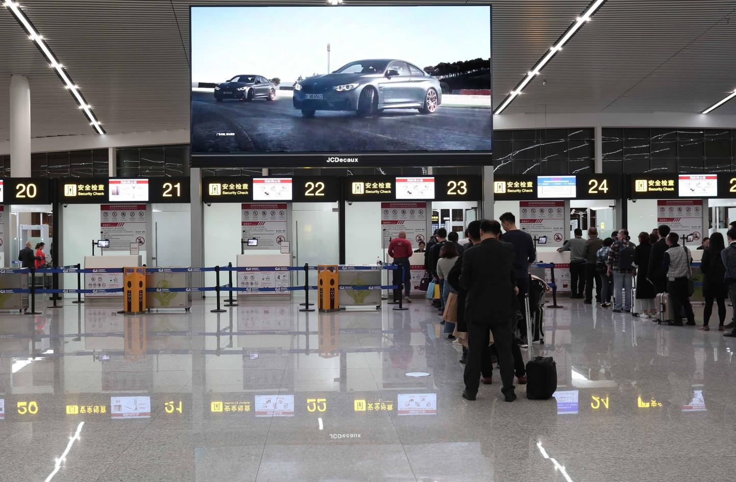 4個引人注目的大型LED屏幕架設(shè)在環(huán)境整潔的 安檢前區(qū)域;