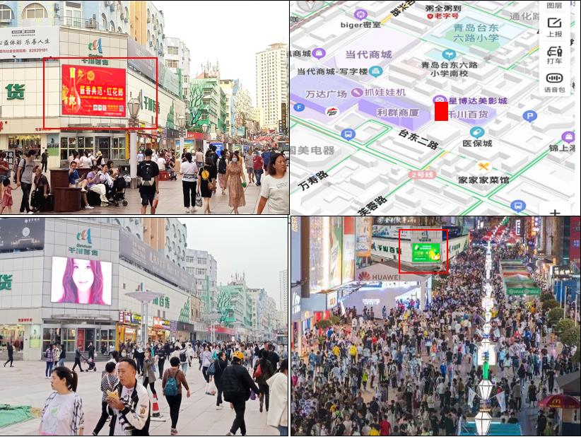 1、屏幕位于臺東三路步行街的中心位置,對面利群商廈,緊鄰萬達(dá)廣場,人流量巨大,屏幕所處位置十分明顯,位于十字路口方向。