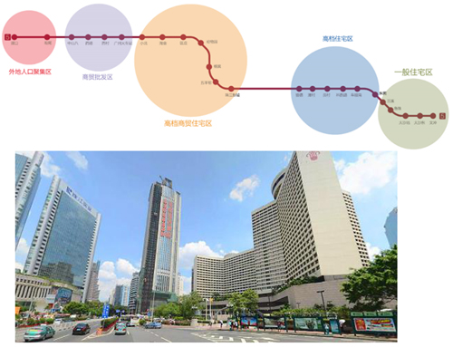 5號線 ——中環(huán)鉑金線:5號線貫穿廣州成熟中心區(qū)(環(huán)市路板塊)和珠江新城CBD商務區(qū)、連接西部發(fā)展區(qū)(大坦沙、滘口)和東部產業(yè)轉移帶(員村、科韻路、東圃、文沖),是東西向軌道交通的骨干線,直接影響廣州的城市整體布局及其功能的發(fā)揮。大量的商貿人群(中山八、廣州火車站)及外資企業(yè)的高級白領(小北、淘金、區(qū)莊)都匯集于此。