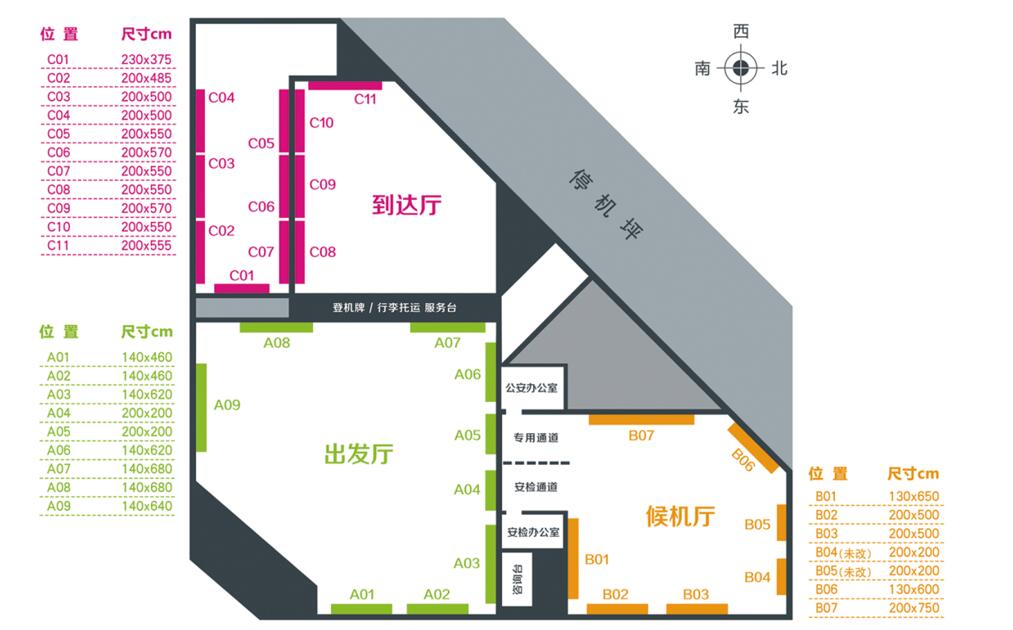 目前,現(xiàn)有機(jī)場候機(jī)樓分為三個(gè)廳,出發(fā)廳、候機(jī)廳和到達(dá)廳共計(jì)27個(gè)廣告位,燈箱采用LED高光漫反射光源及專業(yè)的燈箱布,色彩還原度極好,每個(gè)廣告位只做獨(dú)立宣傳,保證收視唯一性。