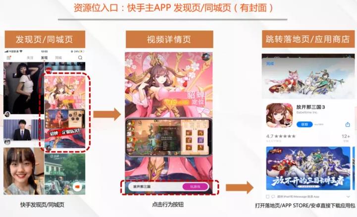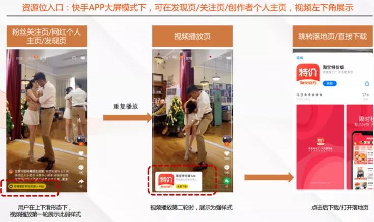 快手APP信息流廣告位在發(fā)現(xiàn)頁第五/六位,短視頻播放過程中可點擊下方行為按鈕,到達(dá)落地頁、淘寶APP,或者跳轉(zhuǎn)到應(yīng)用市場。