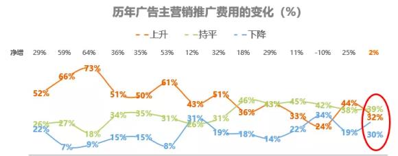 根據(jù)CTR發(fā)布的《2022中國廣告主營銷趨勢調(diào)查》報(bào)告, 2022年,廣告主營銷預(yù)算凈增比例出現(xiàn)收窄。32%的廣告主營銷費(fèi)用上升,明顯低于去年的44%,而降低營銷費(fèi)用的廣告主則占30%,較去年增長11%。