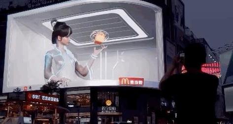 前者目前以裸眼3D屏幕為主,裸眼3D廣告往往能夠呈現(xiàn)出栩栩如生的視覺效果,雖然是廣告,但往往能吸引一大批觀眾駐足觀看并于線上自主二次傳播,達(dá)到廣告宣傳的出色效果。上了無數(shù)次熱搜的成都某古里大屏就是最好的例子,該屏甚至成了地標(biāo)景點(diǎn)的存在,無數(shù)外地游客特意駐足打卡。