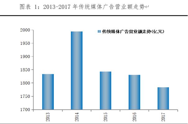 各企業(yè)對廣告投放也不再停留傳統(tǒng)的廣告投放模式,而是尋找用戶心理訴求,打造個性化廣告投放效果。由國家工商總局統(tǒng)計數(shù)據(jù),我國傳統(tǒng)媒體的廣告收入從2013年開始出現(xiàn)斷崖式下滑。2013年,電視廣告收入為1101.1億元,同比下滑2.76%;報紙廣告收入為504.7億元,同比下滑9.16%,四大傳統(tǒng)媒體廣告收入之和為1834.18億元,同比下滑4.09%。雖然2014年轉為正增長,傳統(tǒng)廣告媒體營業(yè)額上升至1994.63億元,但在這之后又開始了連續(xù)三年下滑。