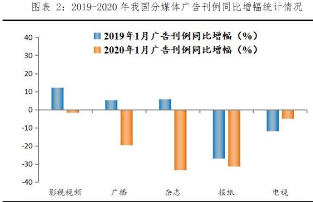 目前,分媒體來看,傳統(tǒng)廣告媒介主要包括影視媒體、報紙媒體、雜志、廣播和電視等。2020年1月,報紙、雜志、廣播等較為傳統(tǒng)的廣告媒介刊例下降幅度較大,報紙、雜志等紙媒下降了將近30%以上,廣播媒介與電視下降了19.5%和4.9%。整體而言,傳統(tǒng)媒體廣告刊例花費呈下降趨勢,報紙、雜志等紙媒首當其沖,其次廣播媒介,最后電視及影視媒介。