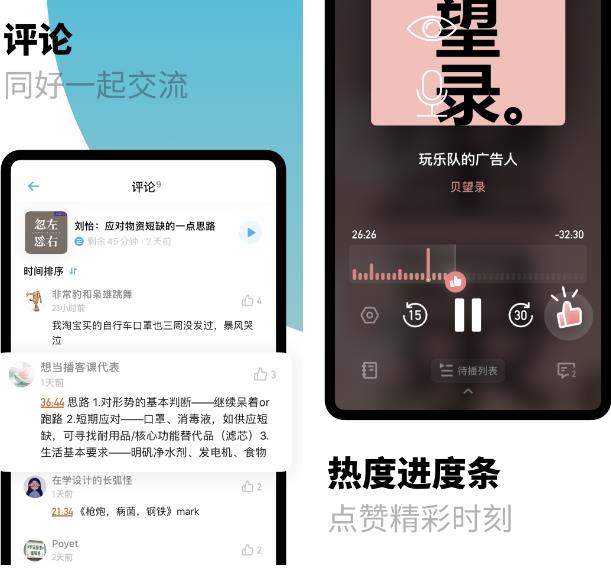 界面特別清新,比其它APP界面簡(jiǎn)潔,可以根據(jù)聽(tīng)到哪一段進(jìn)行評(píng)論,評(píng)論區(qū)有很多令人感同身受的觀點(diǎn)。 —— 南城以南溫暖如初 統(tǒng)計(jì)收聽(tīng)時(shí)長(zhǎng)這個(gè)功能最滿意。
