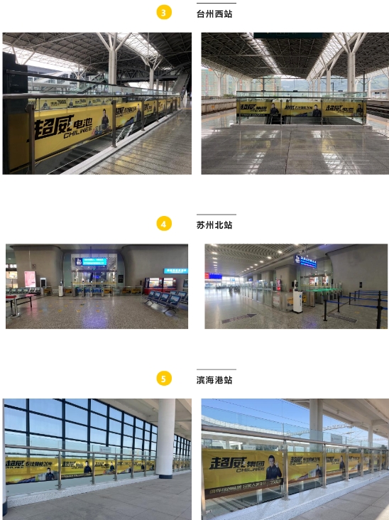 本次超威品牌投放,全面覆蓋 浙江杭州、寧波、臺(tái)州、金華、湖州,江蘇蘇州、鹽城、常熟,安徽合肥、池州、阜陽等國內(nèi)各大城市的重要樞紐站點(diǎn)。無論是候車廳還是站臺(tái),隨處可見亮眼的“超威黃”。