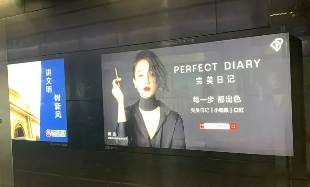 在去年10月,完美日記于北京、廣州、深圳、上海、杭州等全國100個(gè)核心城市投放60萬部電梯智慧屏,配合首支品牌廣告,官宣演員周迅為品牌全球代言人,為其全新的品牌形象宣傳造勢。