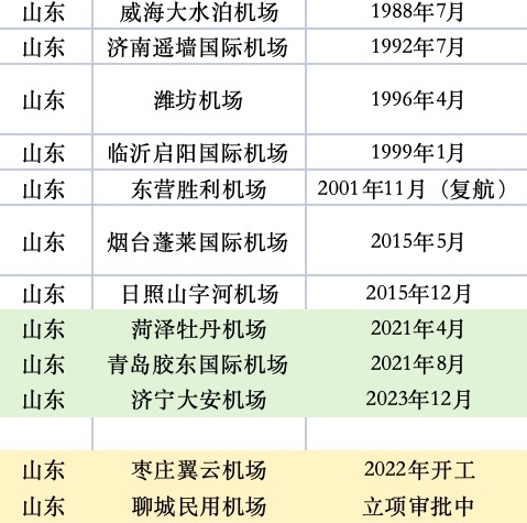 另一個經(jīng)濟大省山東,也正瘋狂建機場。菏澤牡丹機場、青島膠東國際機場、濟寧大安機場分別于2021年4月、2021年8月、2023年12月建成通航。此外,棗莊翼云機場已經(jīng)于2022年開工,聊城民用機場項目也在積極推進中,于5月剛剛進行選址意見批前公示。