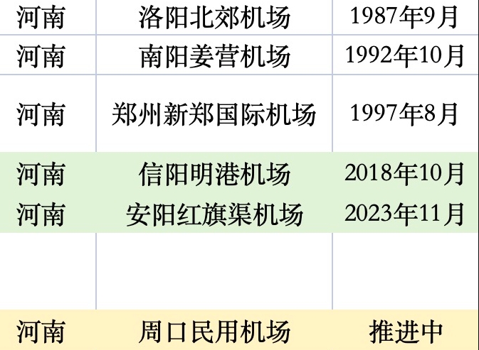 河南目前僅有5座民用機場通航,其中2座在2018年后通航。周口機場項目場址已選定,仍在等待批復。商丘機場、潢川機場、平頂山機場、三門峽機場等4座機場則在規(guī)劃中,目前尚無明確進展。