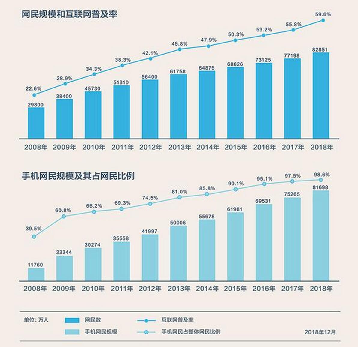 2019年2月28日,中國互聯(lián)網(wǎng)絡(luò)信息中心(CNNIC)發(fā)布第43次《中國互聯(lián)網(wǎng)絡(luò)發(fā)展?fàn)顩r統(tǒng)計報告》。報告顯示,截至2018年12月,我國網(wǎng)民規(guī)模為8.29億,其中手機網(wǎng)民占比達(dá)98.6%,互聯(lián)網(wǎng)普及率達(dá)59.6%。上圖為網(wǎng)民規(guī)模和互聯(lián)網(wǎng)普及率。下圖為手機網(wǎng)民規(guī)模及其占網(wǎng)民比例。